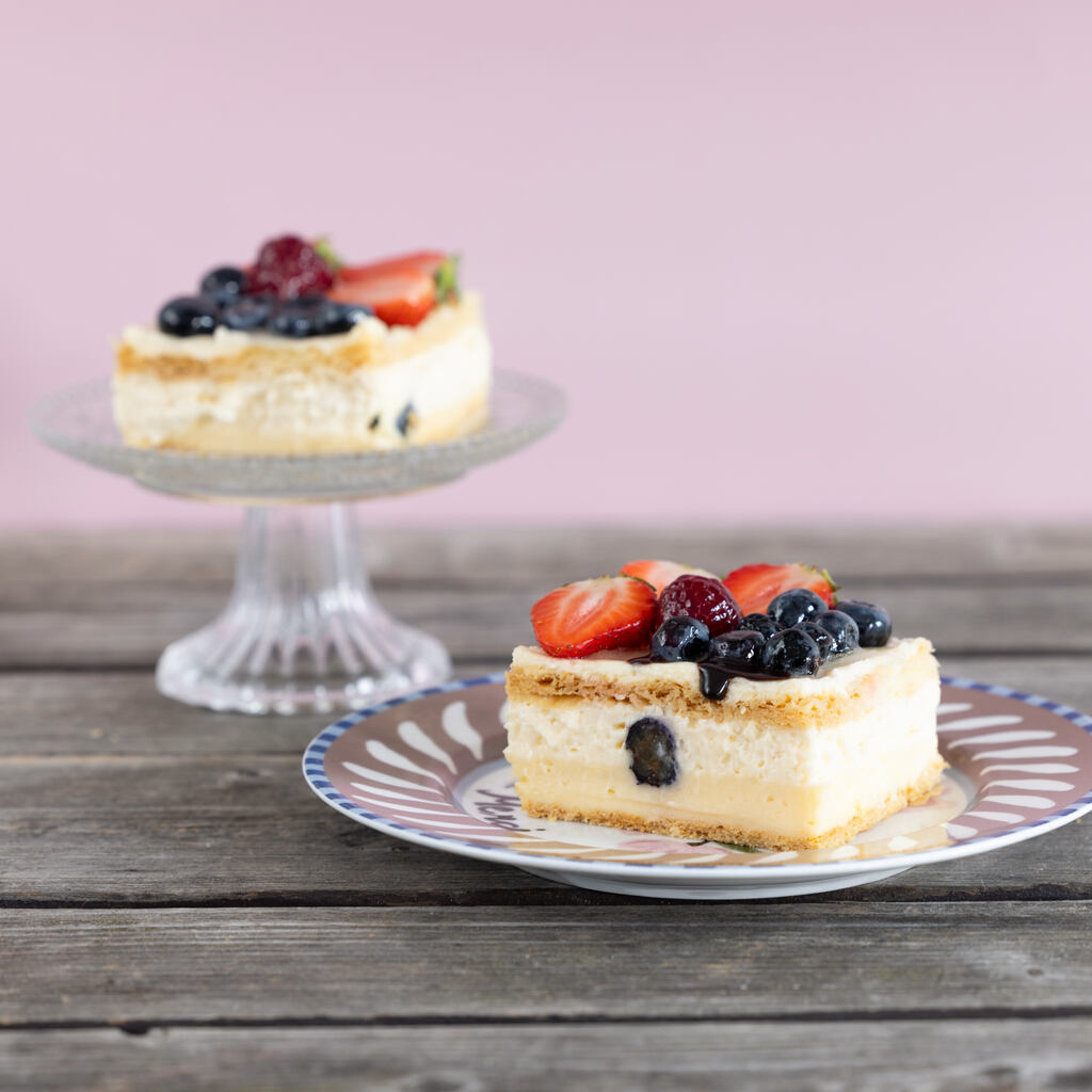 Nasze kremówki to delikatne ciasto francuskie, aksamitny krem i świeże, soczyste owoce — deser w najlepszym wydaniu.