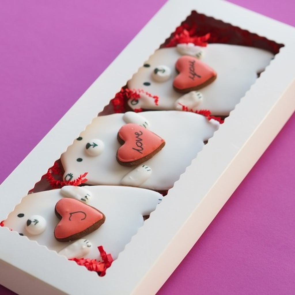 Wyjątkowy zestaw trzech ręcznie wykonanych misiów z piernika, ozdobionych serduszkami i zapakowanych w stylowe pudełeczko.