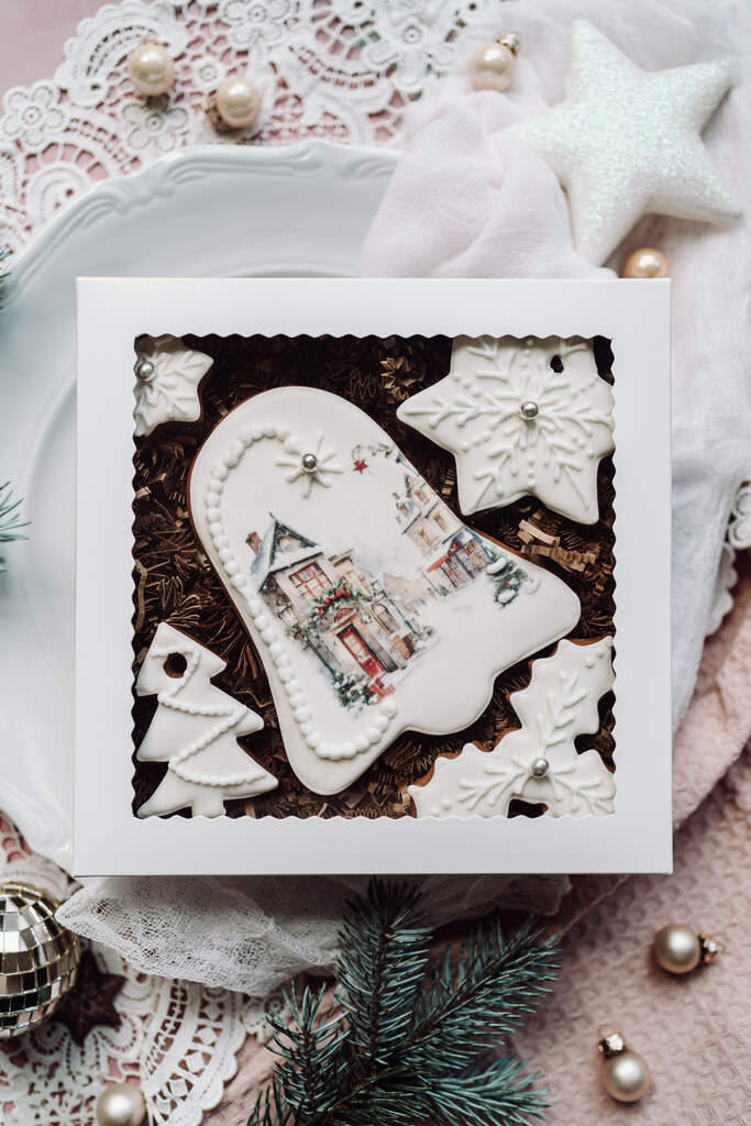 Elegancja i świąteczna magia zamknięte w jednym pudełku! Wspaniale zdobiony piernik w kształcie dzwonka, przedstawiający malowniczy zimowy krajobraz, otoczony subtelnymi płatkami śniegu i choinką. Idealny prezent lub dekoracja, która wprowadzi wyjątkowy klimat Bożego Narodzenia. Całość zapakowana w ozdobne pudełko, gotowe, by zachwycić!