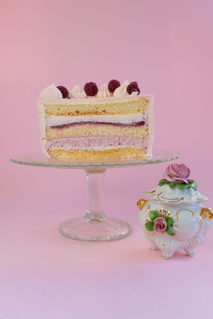 Tort „Malinowe lato” składa się z jasnych biszkoptów, chrupki z białej czekolady, kremu malinowego oraz kremu śmietankowego z malinową frużeliną.