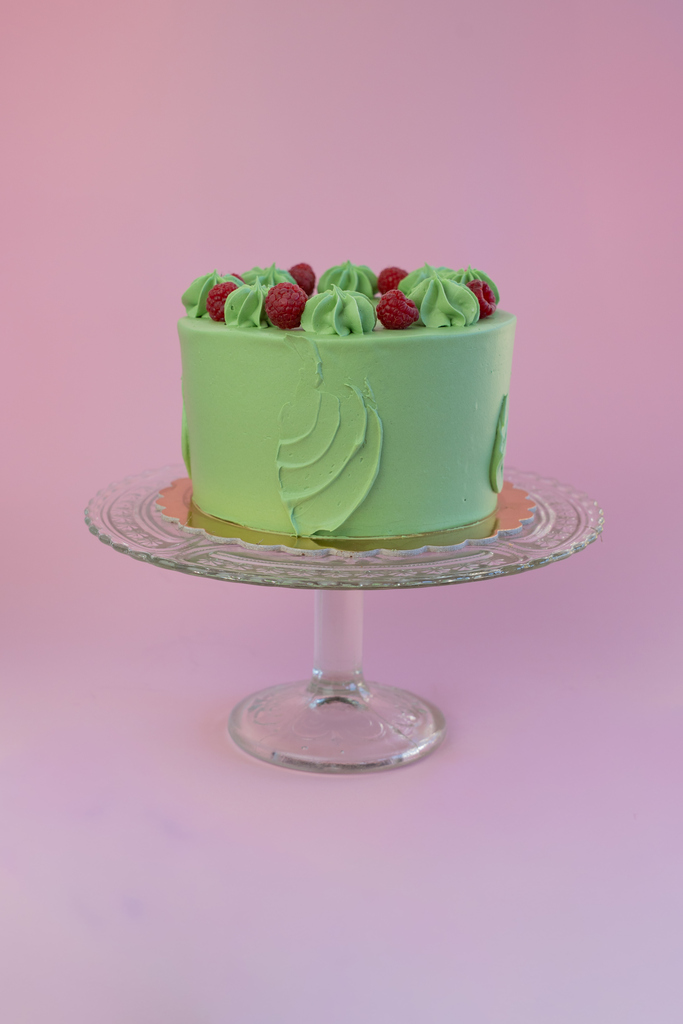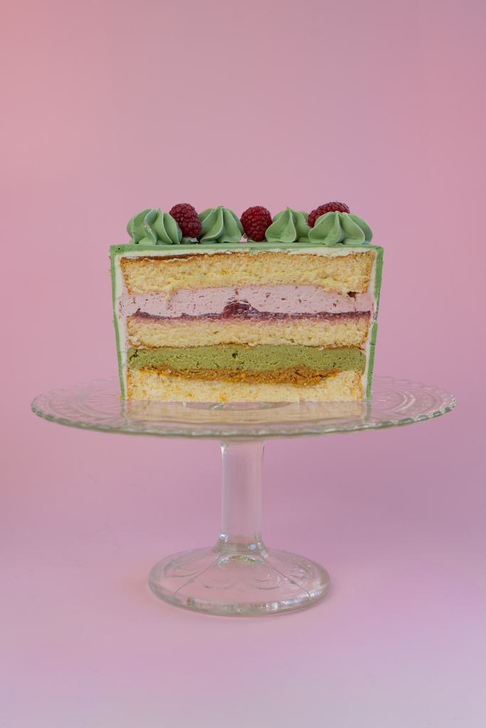 Tort pistacjowy składa się z jasnych blatów biszkoptowych, przełożonych chrupką pistacjową oraz masą malinową z żelką malinową. Całość dopełnia czekoladowy krem pistacjowy.